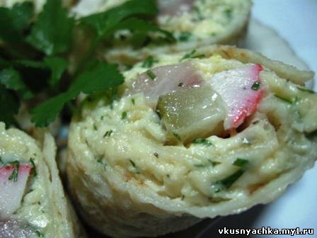 Пожарить блинчики, плавленые сырочки потереть на терке, добавить чеснок через чеснокодавилку, мелко рубленную зелень, майонез. Перемешать. Нанести на блинчики средним слоем. На один краз блинчика положить сельдь брусочками, огурец брусочками, крабовую палоску брусочками. Свернуть рулетом, охладить, нарезать. И приятного аппетита!